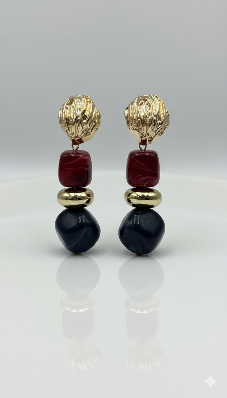 Dokulu altın form ile derin bordo ve lacivert tonların dengeli birleşimi, bu küpeye sofistike bir karakter kazandırır. Katmanlı yapısı sayesinde hacimli ama zarif bir duruş sunar. Sanatsal detaylarıyla klasik kombinleri yükselten, modern stillere ise güçlü bir ifade katan özel bir parça.
