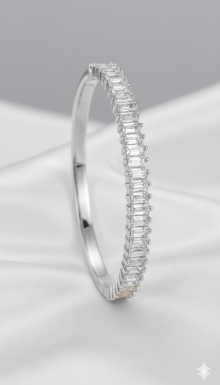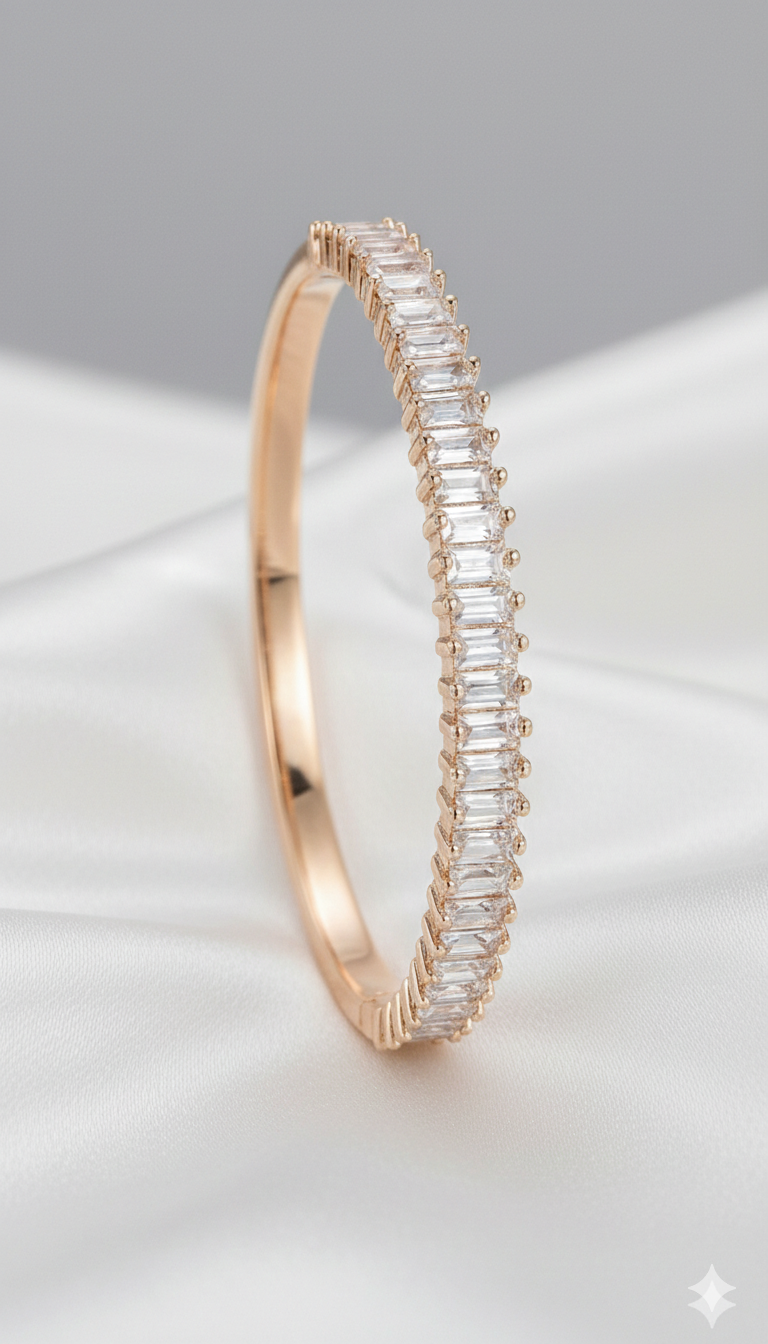 Kesintisiz dizilen baget taş formu sayesinde bilekte net, güçlü ve zamansız bir ışıltı sunar.