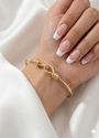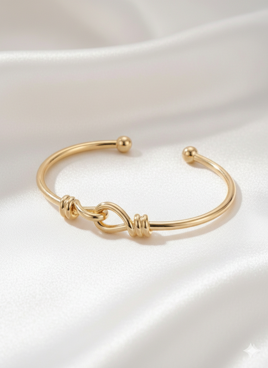 Yumuşak düğüm formu ve sade altın çizgisiyle minimal ama güçlü bir zarafet sunar.