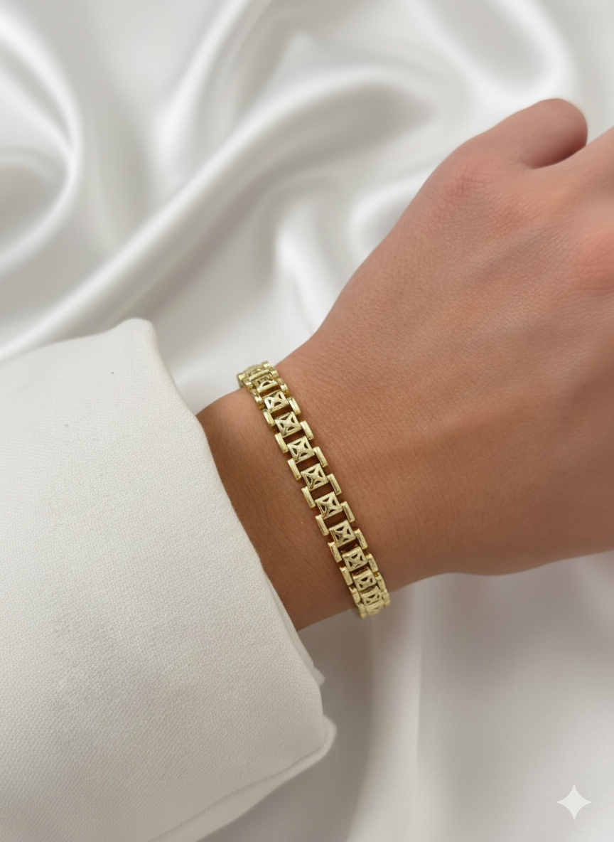 Geometrik zincir dokusu ve güçlü formuyla modern bir duruş sunar.