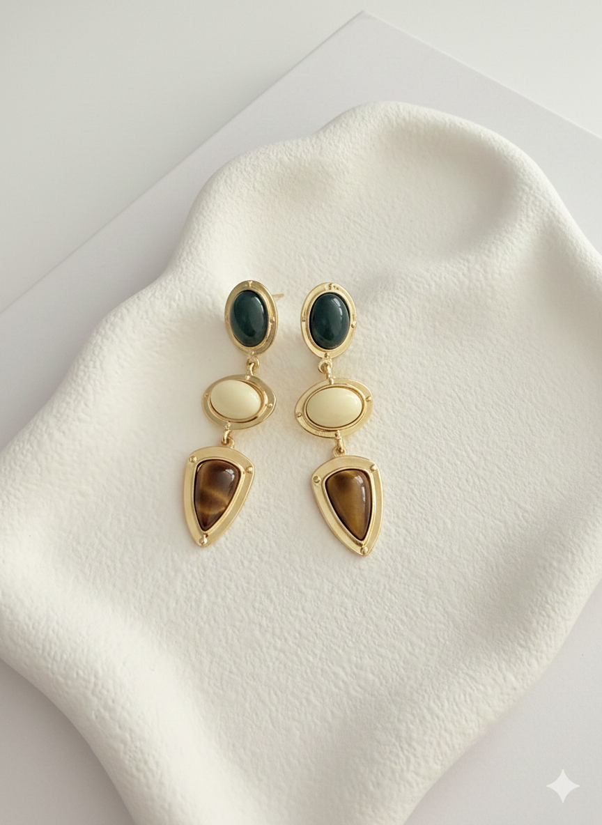 Doğal taş görünümlü yeşil, fildişi ve sıcak kahve tonlarının ardışık formda buluşmasıyla zarif ve dengeli bir siluet sunar. Altın çerçeve detayları küpeye sofistike bir duruş kazandırırken, akışkan yapısı sayesinde hem gündüz hem akşam kombinlerine uyum sağlar. Doğadan ilham alan renk geçişleriyle modern ve özgün bir stil tamamlayıcısıdır.
