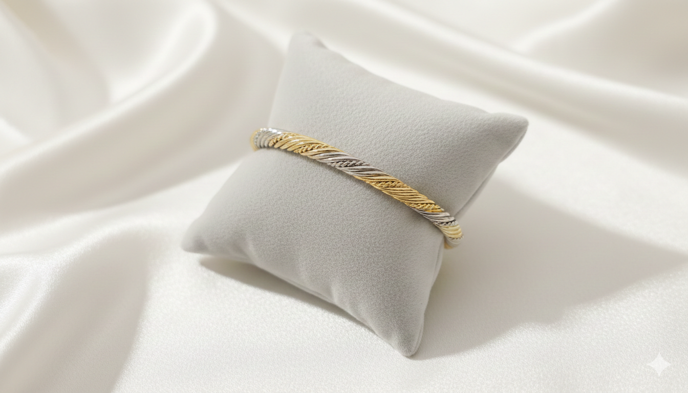 Altın ve gümüş tonlarının örgü formda buluşmasıyla dengeli ve sofistike bir şıklık sunar.