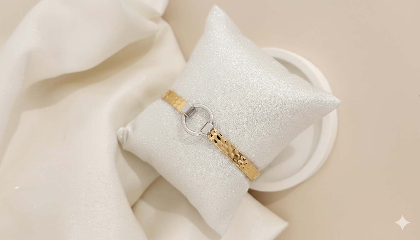 İki tonlu metal dokusu ve merkezdeki halka detayıyla modern bir zarafet sunar.