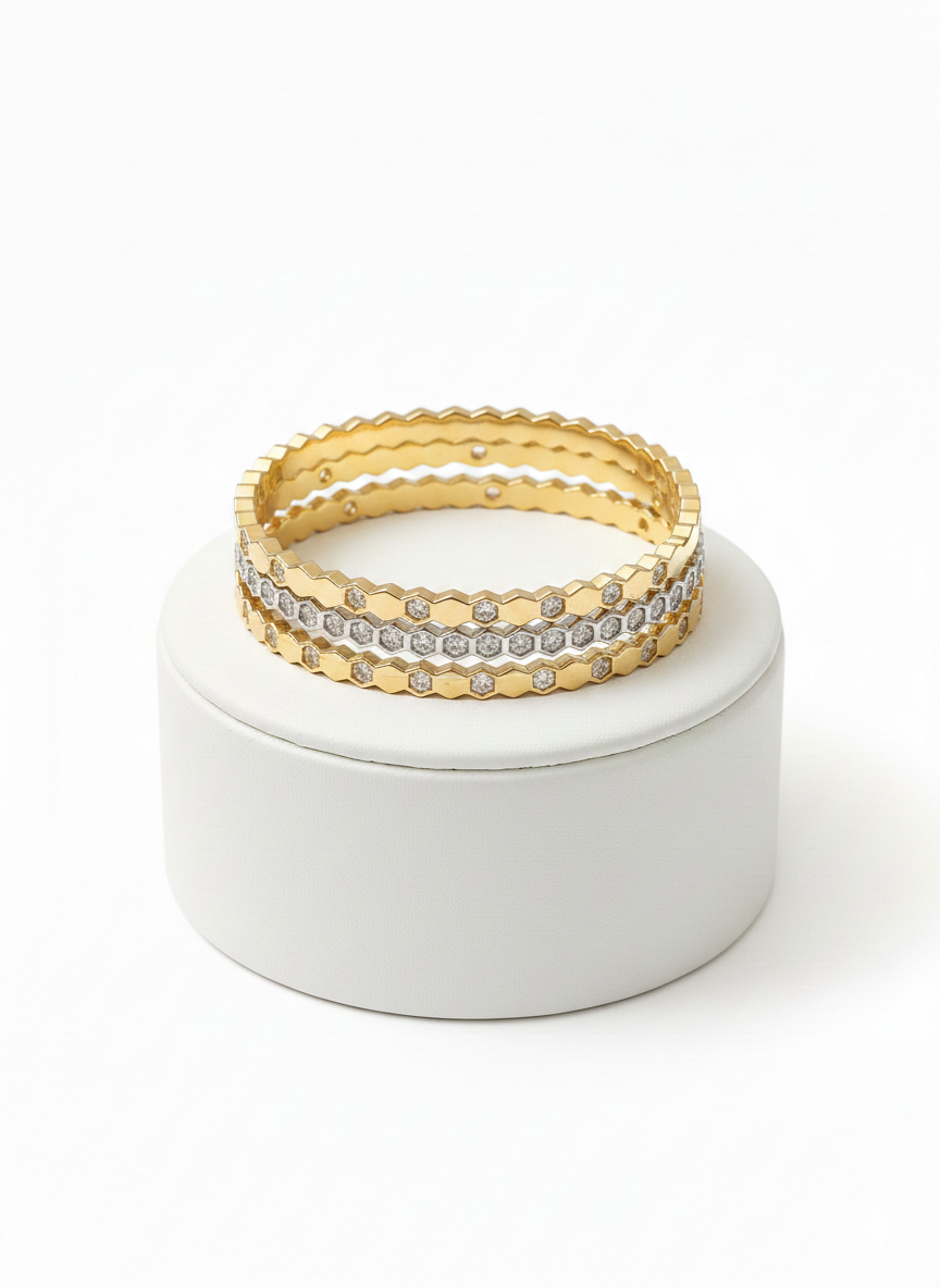 Geometrik dokusu ve ışıltılı taş detaylarıyla modern lüksü güçlü bir formda sunar.