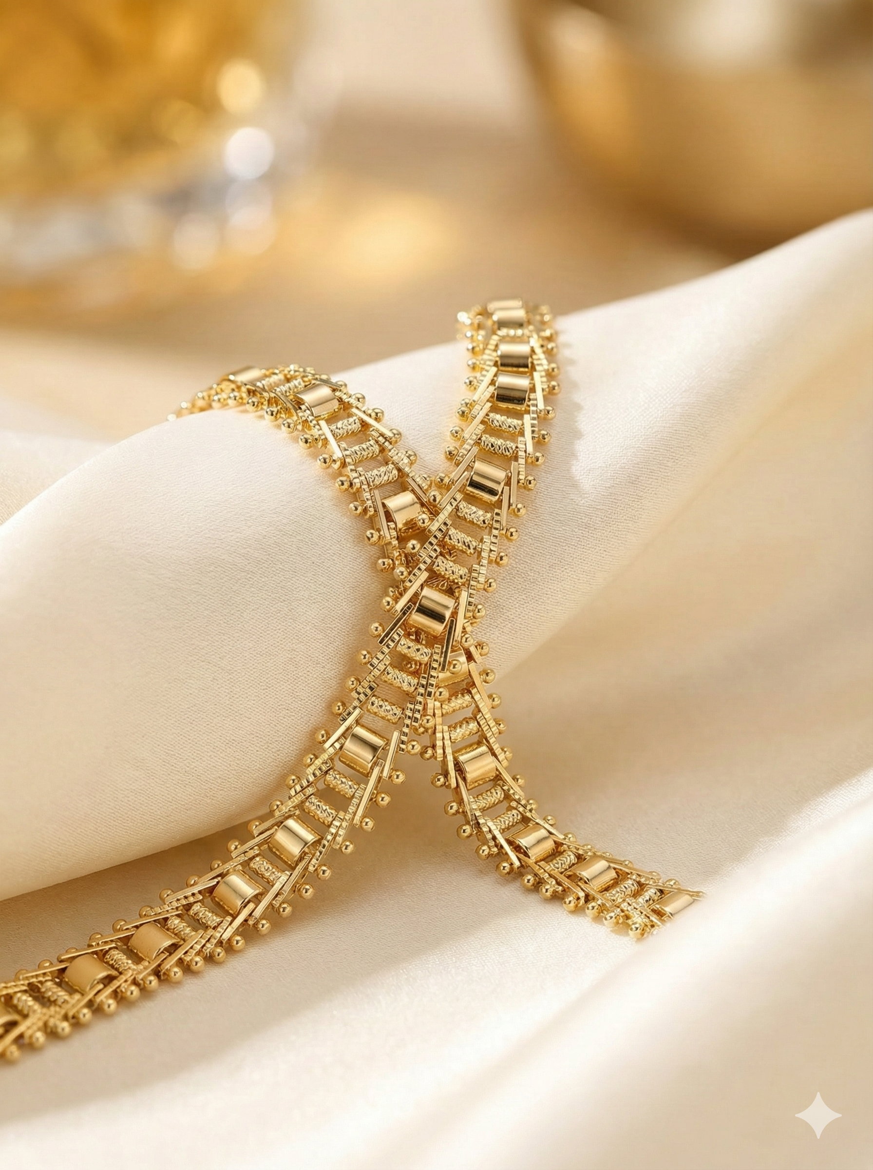 İnce boncuk detayları ve parlak zincir yapısıyla bilekte sofistike bir ışıltı bırakır.