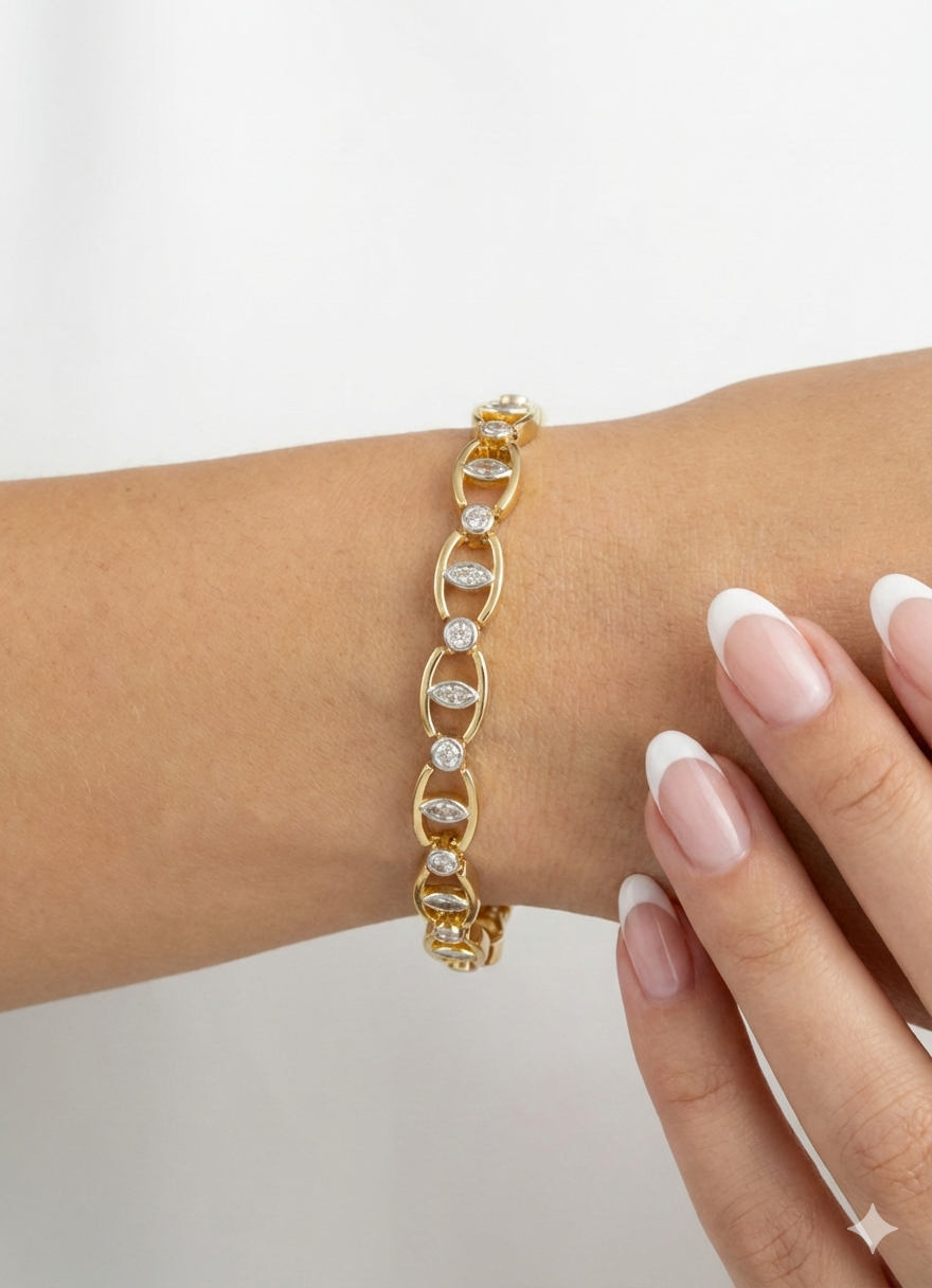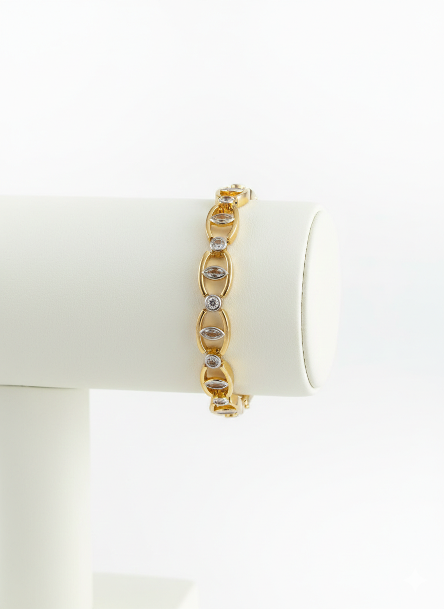 Zarif oval formlar ve ışıltılı taş geçişleriyle bilekte dengeli ve sofistike bir etki yaratır.