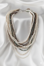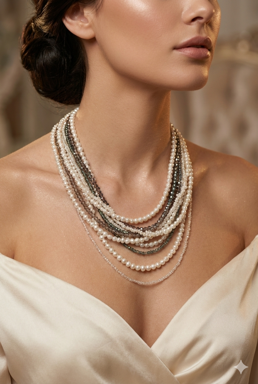 Doğal taş ve inci dokularının çok katmanlı uyumunu modern bir zarafetle sunar.