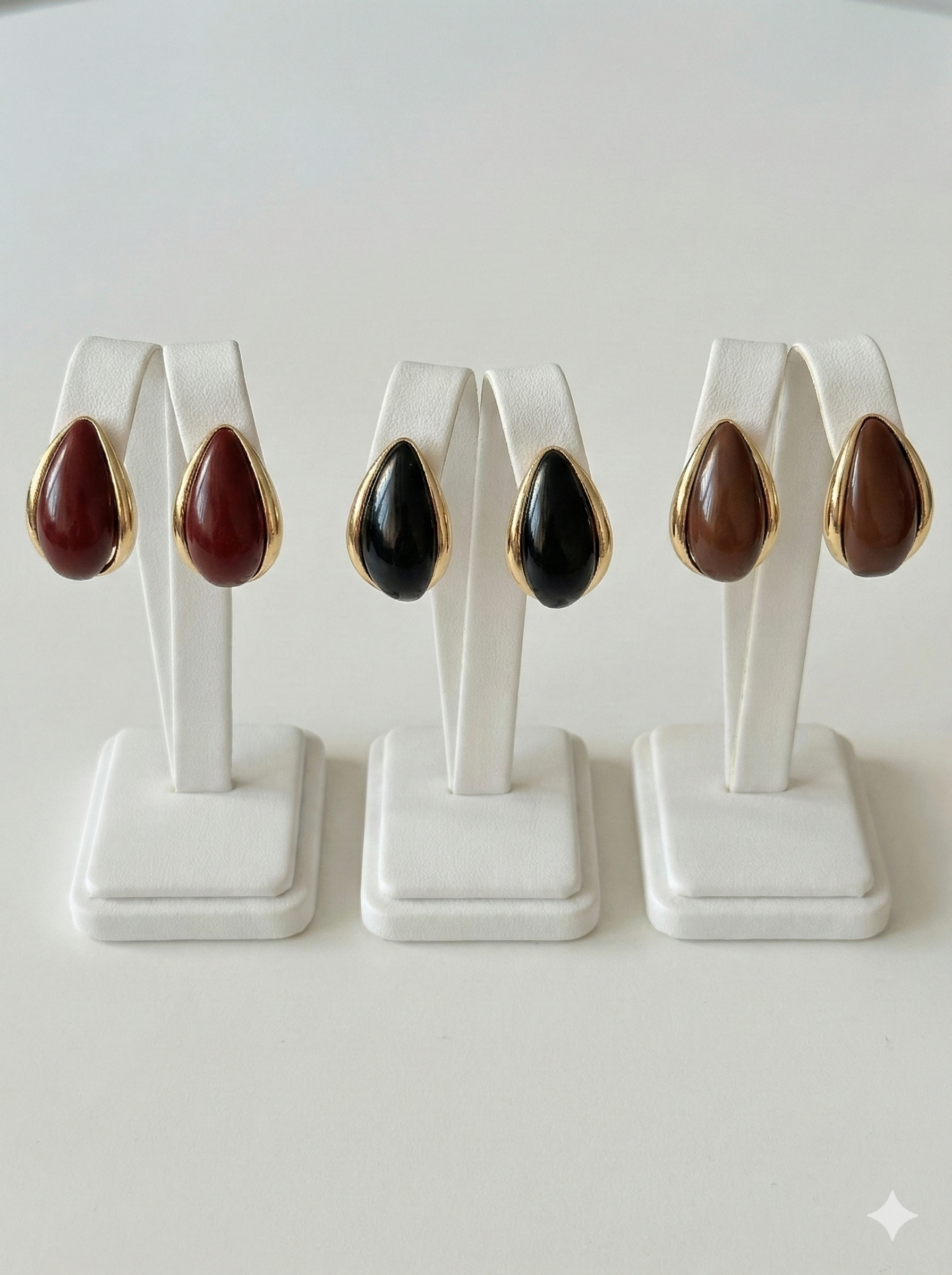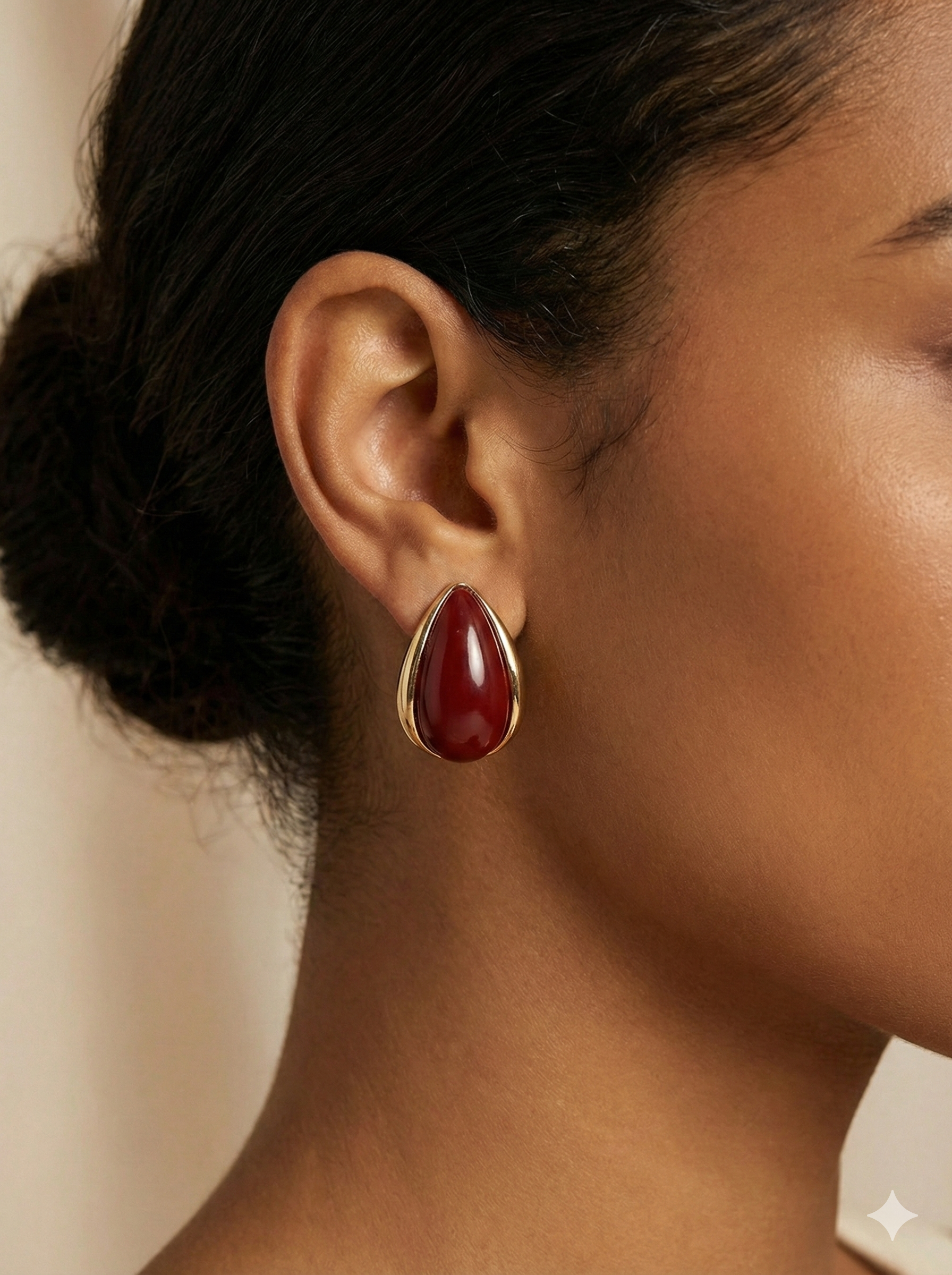 Zarif damla silueti ve parlak taş yüzeyiyle klasik şıklığı modern bir çizgide sunar. Altın tonlu çerçevesi, taşın derin rengini vurgulayarak güçlü ama dengeli bir etki yaratır. Günlük kombinlerden özel davetlere kadar stilini tek dokunuşla tamamlamak isteyenler için ideal bir parça.