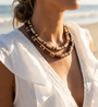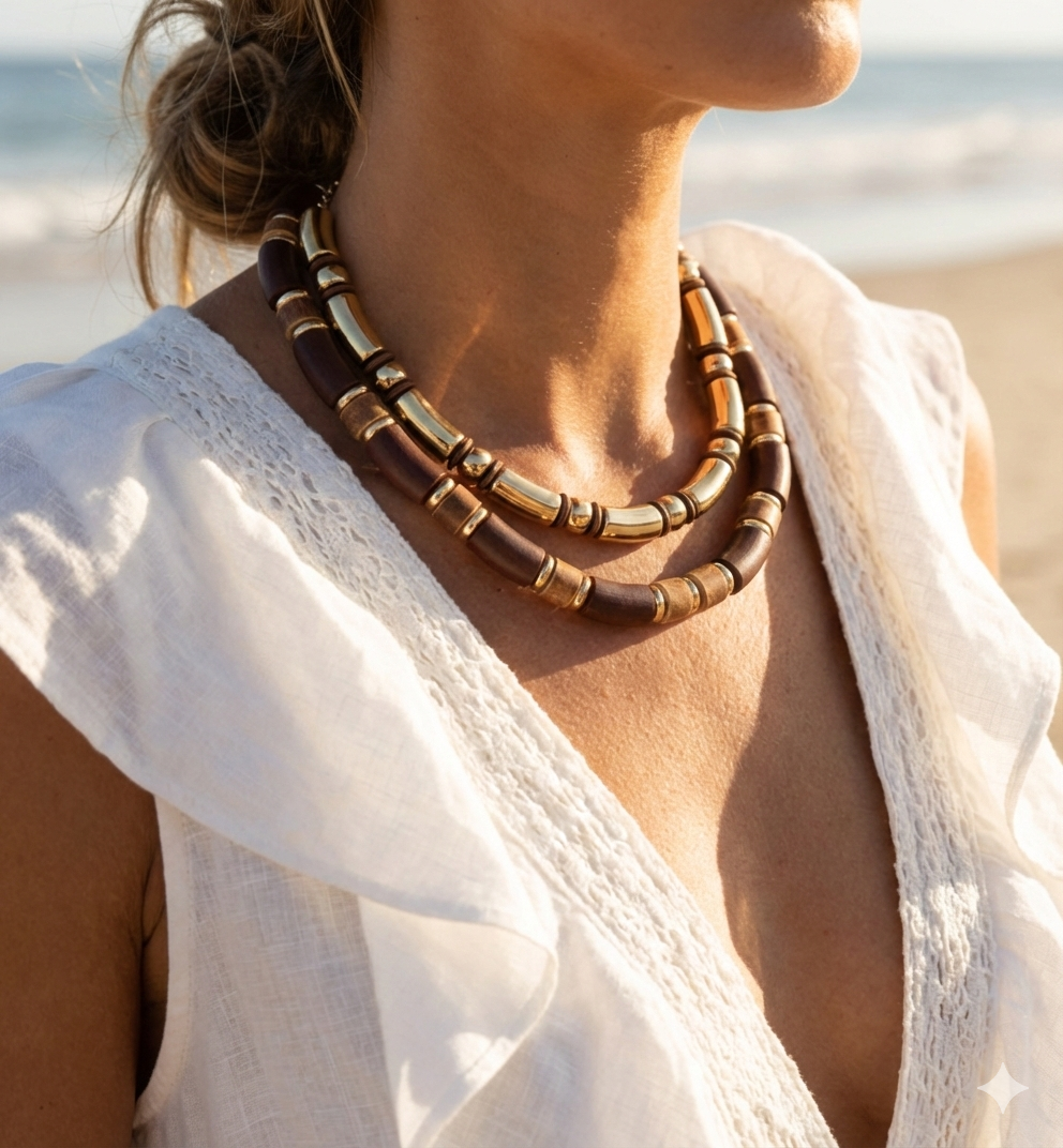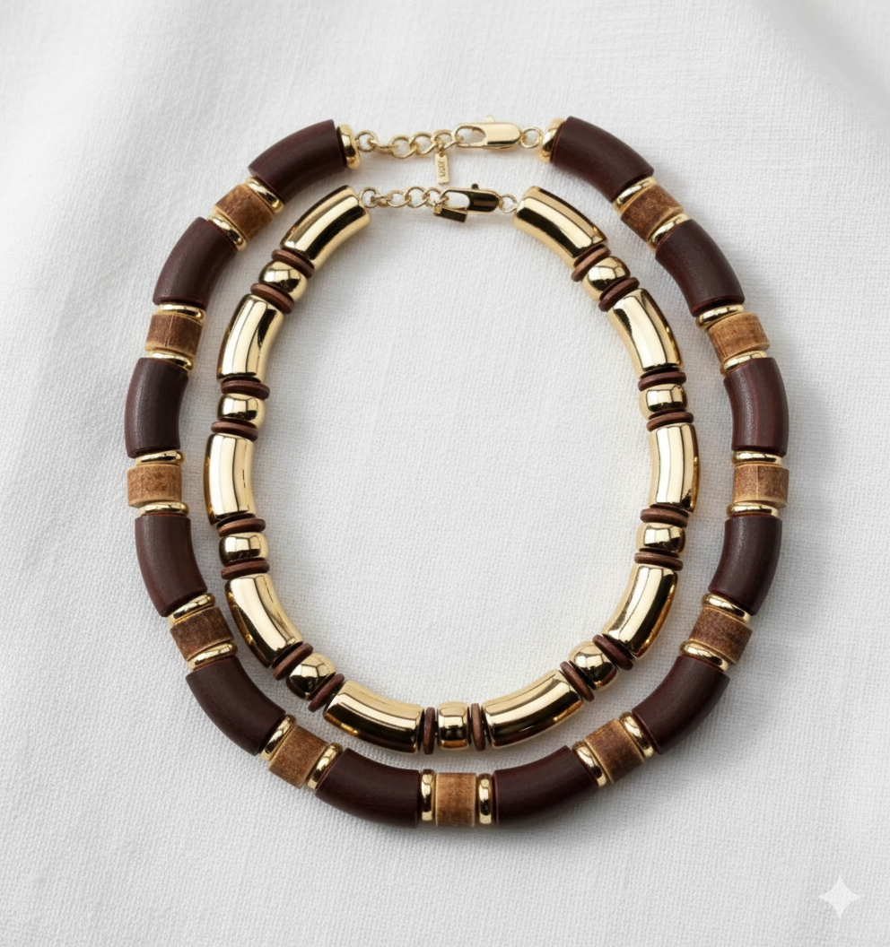 Ahşap dokular ve altın tonlu detaylarla güçlü, dengeli bir stil sunar.