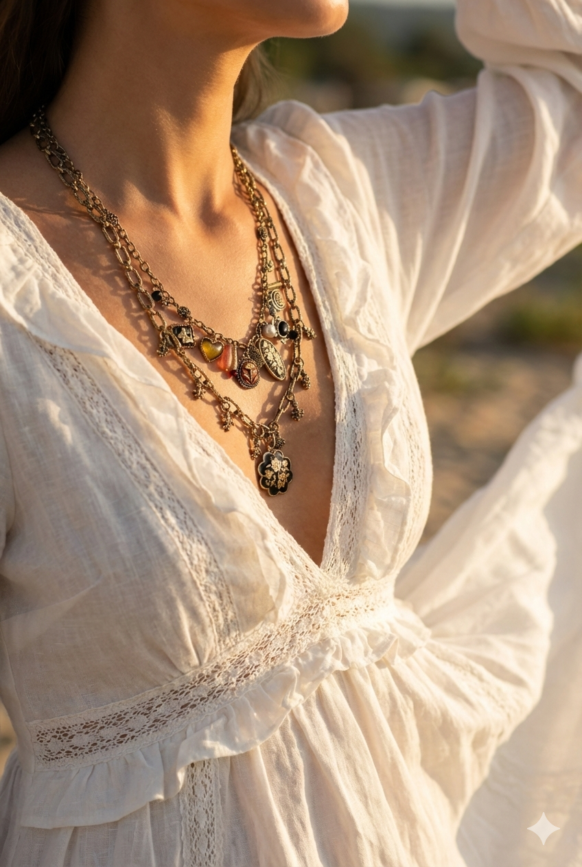 Farklı sembollerin ve zincir dokularının birleşimiyle karakterli ve özgün bir stil sunar.