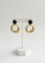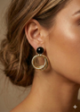 Katmanlı halka formu ve güçlü altın tonlu yapısıyla tasarlanan bu küpe, modern şıklığı iddialı bir siluetle buluşturur. Üst bölümde yer alan koyu taş detayı tasarıma derinlik kazandırırken, hareketli halka yapısı kulakta hacimli ve etkileyici bir duruş yaratır. Günlük kombinlere sofistike bir dokunuş eklemek ya da sade bir stili öne çıkarmak için ideal bir parçadır.
