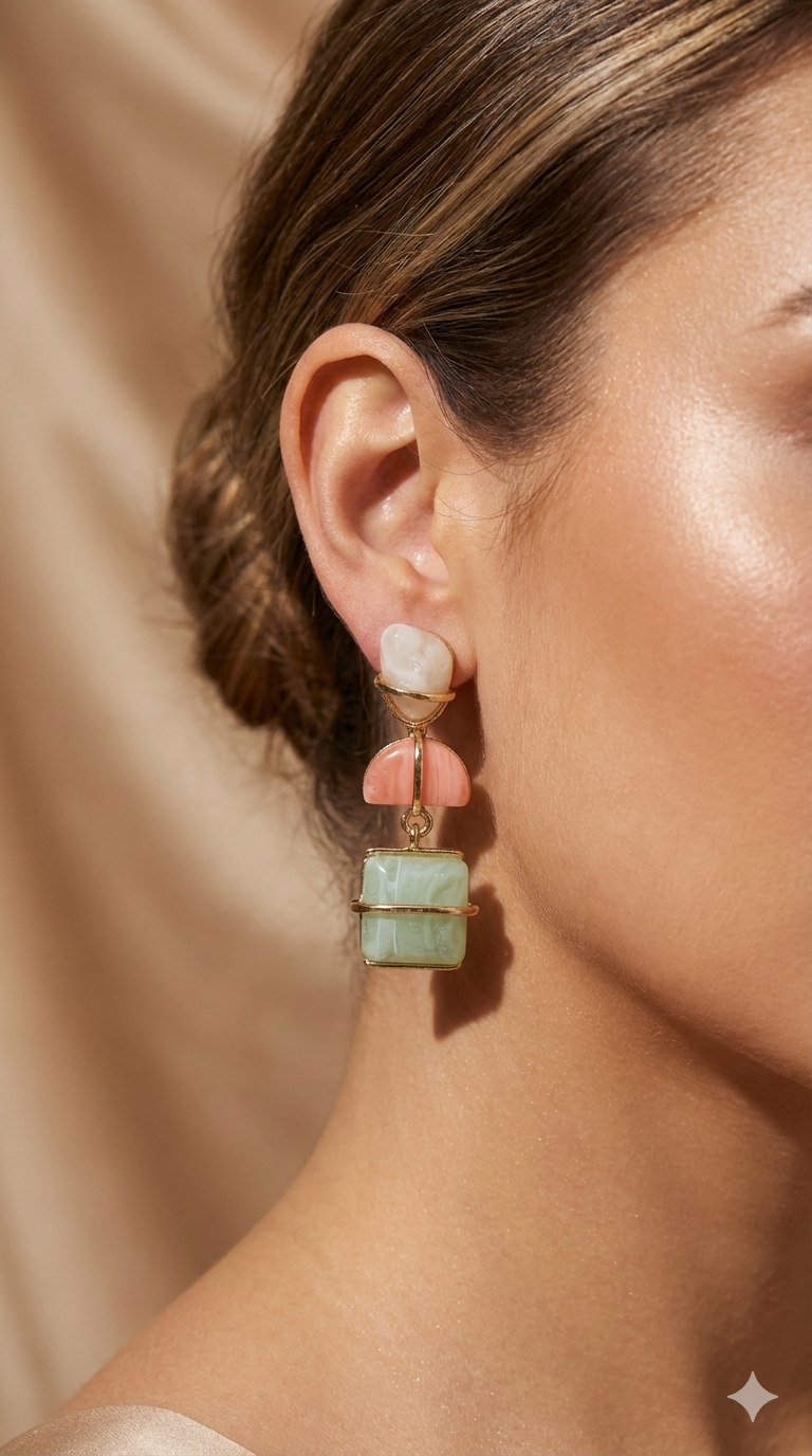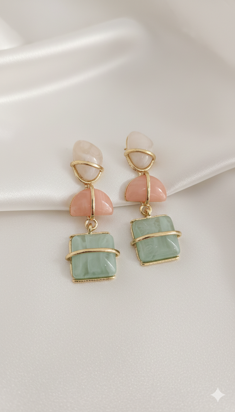 Yumuşak pastel tonların uyumunu geometrik formlarla buluşturan bu tasarım, zarif ama dikkat çekici bir stil sunar. Üst bölümde yer alan açık tonlu taşlar, alt kısımda kullanılan mint yeşili kare form ile dengeli bir kontrast oluşturur. Altın renkli ince çerçeve detayları, küpeye modern ve rafine bir dokunuş katar. Günlük kombinlerde sofistike bir vurgu, özel anlarda ise sade bir şıklık arayanlar için ideal bir tamamlayıcıdır.
